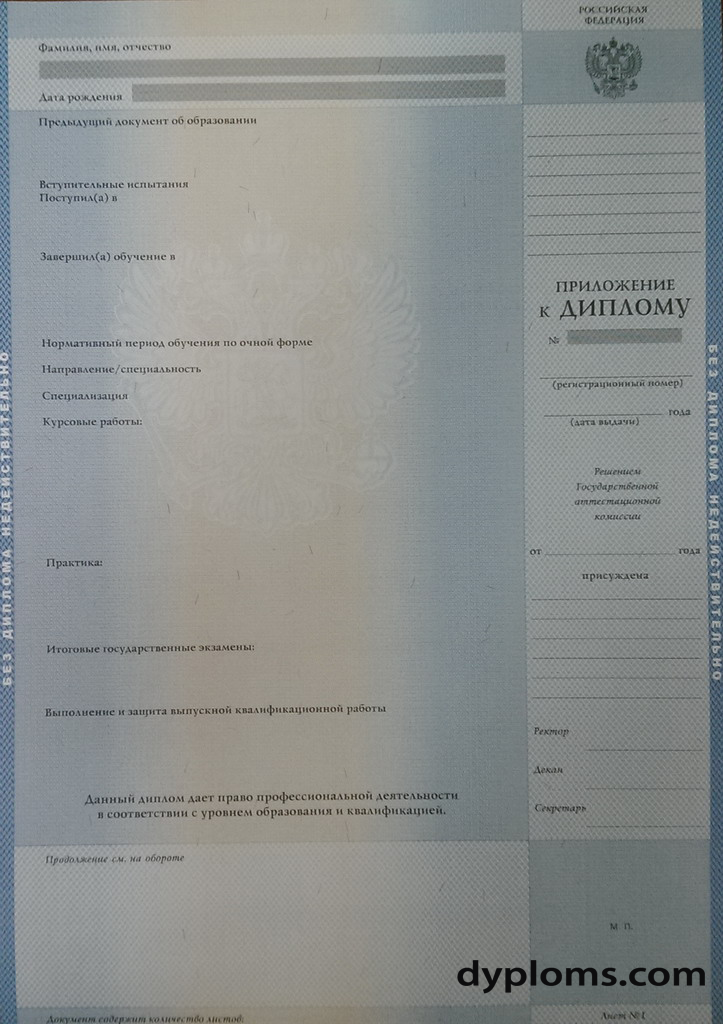 Наша компания готова изготовить диплом любого высшего учебного заведения Российской Федерации с присвоением квалификации "бакалавр", "специалист" или "магистр". Дополнительно доступно оформление документа об окончании образовательного учреждения с отличием. При решении купить диплом вуза с реестром за 2004-2009 годы у нашей компании, вы получаете документ со следующими характеристиками: